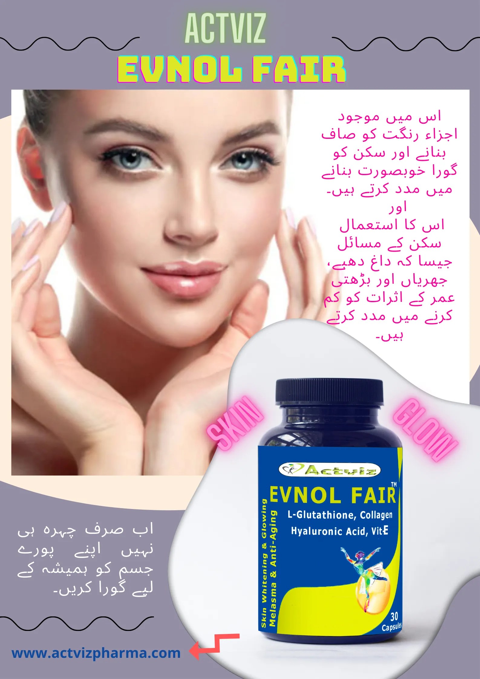 Actviz Evnol Fair is a food supplement with a powerful antioxidant Glutathione, Collagen, Hyaluronic Acid, vitamin E and vitamin C (Ascorbic acid). which helps to reduce oxidative stress, detoxify the body and maintain health of skin cells to give a younger and healthy complexion. It also helps to improve the body’s immune system.